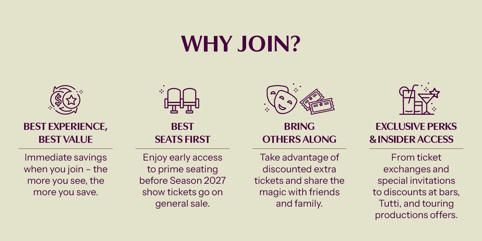 Perfect if you love coming to Season shows, but you’re not ready to plan and purchase in advance. Enjoy simple savings every time you visit, and book shows at your leisure throughout the year.